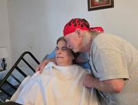 Mark Smith hugs his wife, Robin Smith, in their home in Lake Charles, Louisiana.